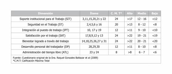 Se asumirá el concepto de Calidad de Vida Laboral, base para la validación del instrumento, como aquel referido a: “Un concepto multidimensional que se integra cuando el trabajador, a través del empleo y bajo su propia percepción, ve cubiertas las siguientes necesidades personales: soporte institucional, seguridad, integración al puesto de trabajo y satisfacción por el mismo, este concepto identifica el bienestar obtenido a través de la actividad laboral, el desarrollo personal logrado, así como la eficaz administración del tiempo libre” 4.