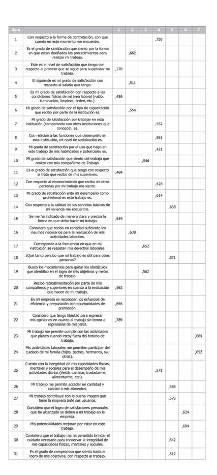 Ahora, para el Análisis factorial por componentes principales: los 31 reactivos tuvieron una distribución normal, la prueba de KMO = 0.9 rebasó los límites mínimos esperados de adecuación muestral; la prueba de esfericidad de Barlett p < 0.001 indicó una matriz de identidad adecuada para el modelo analítico. Se identificaron 7 factores con autovalores (eigenvalores) mayores a 1 que explicaron el 62.5% de la varianza total. El rango de cargas factoriales osciló entre 0,426-0,809. Valores que son interpretados como favorables para continuar con el análisis factorial.