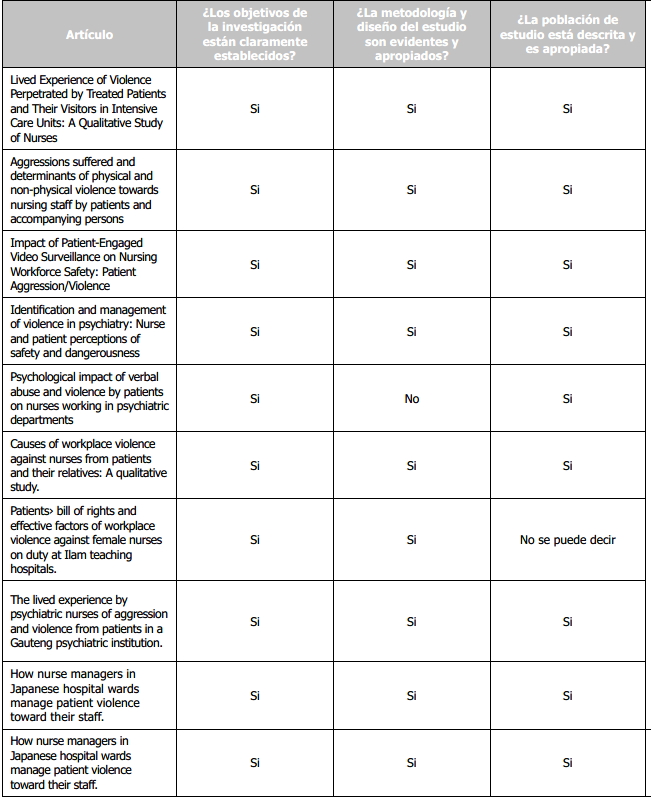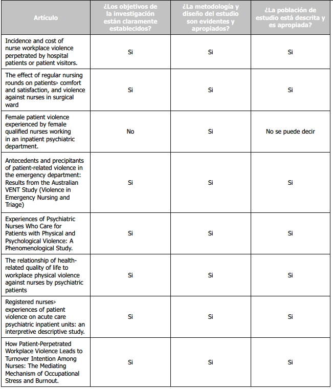Es por ello, que esta investigación busca examinar el contenido de investigaciones sobre violencia de pacientes hacia enfermeras en instituciones hospitalarias, población objeto de los estudios, objetivos, instrumentos usados, resultados, recomendaciones y limitaciones, en estudios dirigidos únicamente hacia este tipo de violencia en el lugar de trabajo, con el propósito de identificar posibles rutas de investigación futuras en torno a este fenómeno, que permita a las instituciones hospitalarias tomar decisiones orientadas a reducir su ocurrencia y mitigar sus consecuencias para las enfermeras, los pacientes y las propias instituciones, propiciando en el lugar de trabajo condiciones para lograrlo.