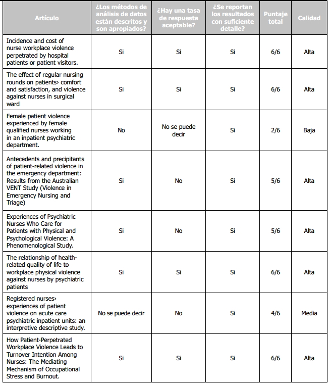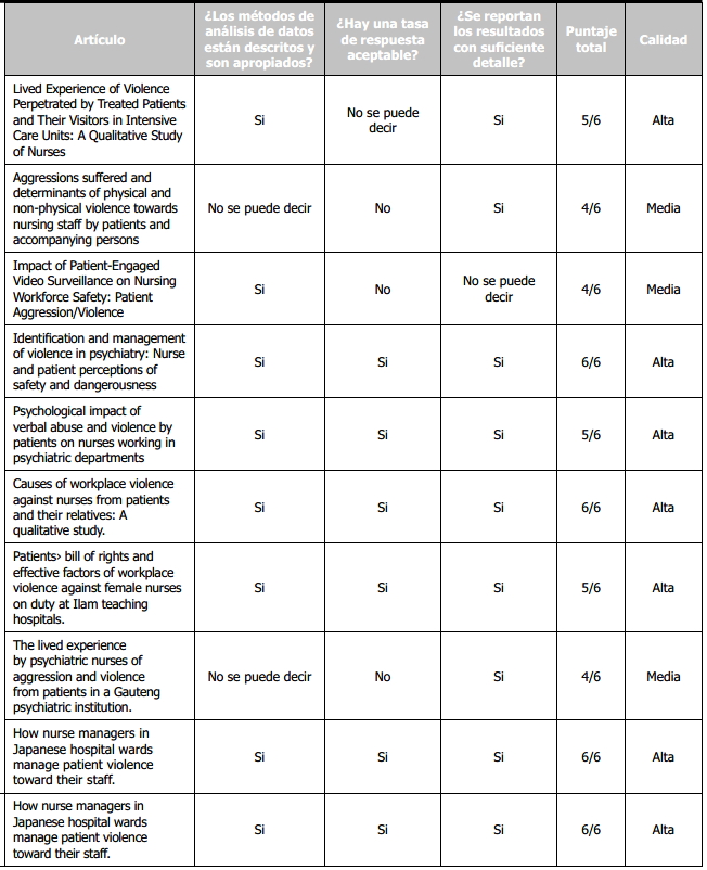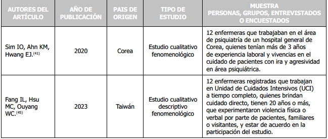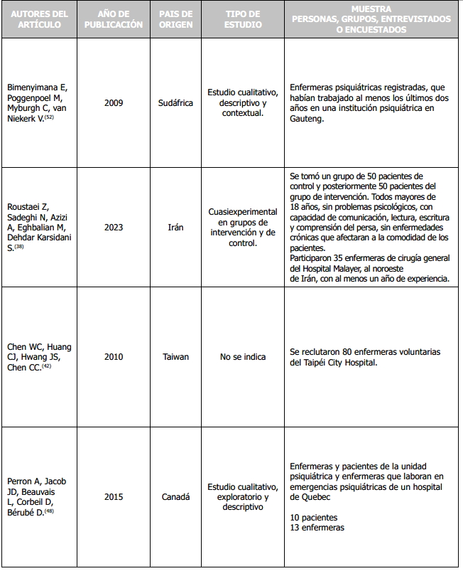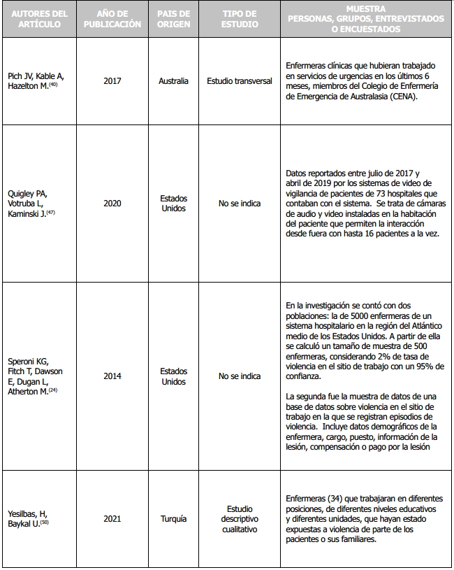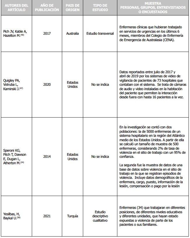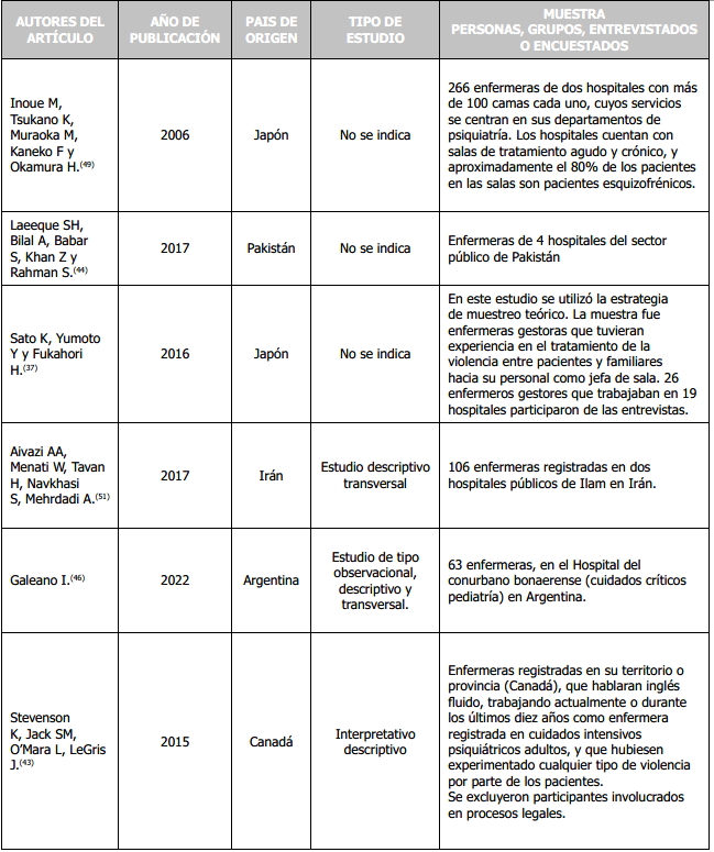 Las investigaciones objeto de análisis que tienen origen en Estados Unidos, Japón, Irán, Canadá, Taiwán aportan cada uno dos artículos sobre este fenómeno. Australia, Turquía, Pakistán, Argentina, Corea y Sudáfrica aportan cada uno un artículo a esta revisión. El primer artículo data del 2006 y el último del año 2023. La principal justificación que da origen a las investigaciones sobre violencia de los pacientes hacia las enfermeras es el aumento de la violencia en el trabajo5,6 el reconocimiento del alto riesgo de violencia en el trabajo entre las ocupaciones de salud7, específicamente en enfermería8,9,10, así como la violencia en los servicios de urgencias11,12 y en los entornos hospitalarios13.