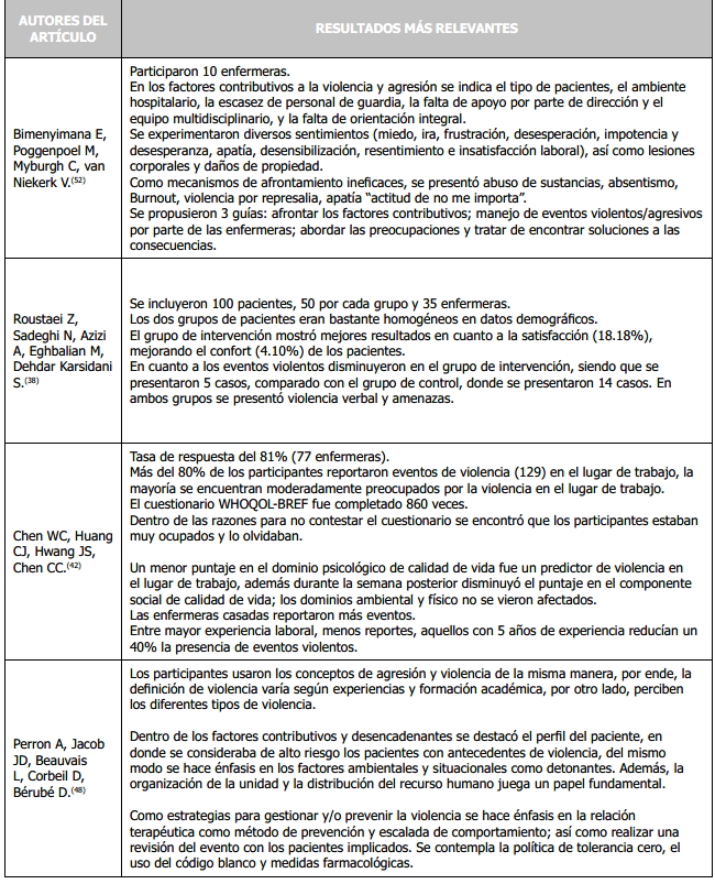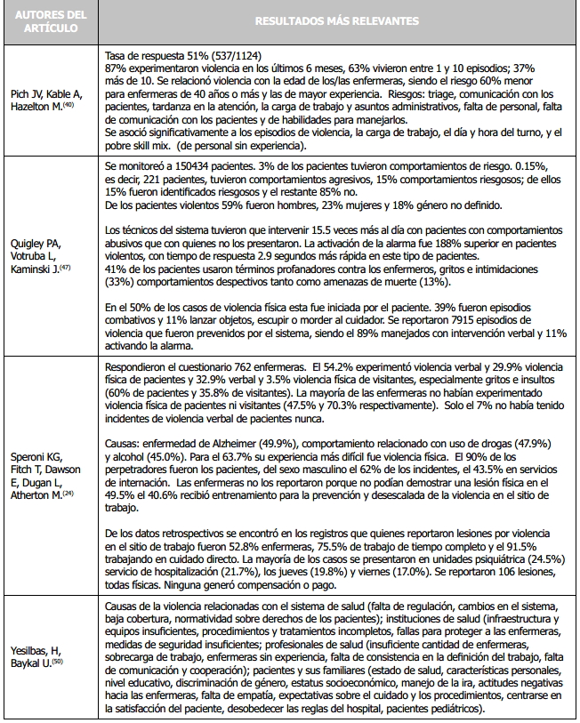 Llama la atención la disminuida producción de estudios en países latinoamericanos. Se destaca también que varios estudios indagan sobre causas y tipos de violencia de pacientes hacia enfermeras y pocos sobre los mecanismos usados para prevenirla y manejarla, incluyendo la importancia del reporte. Igualmente llama la atención que la fuente de información de varios estudios sea la enfermera, cuando conocer la perspectiva del paciente podría aportar a reducir factores de riesgo para la ocurrencia de estos episodios de violencia.