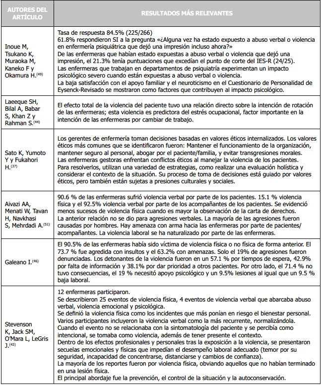 Respecto a los resultados más relevantes de los estudios analizados, se encontró que gran parte de las enfermeras que participaron reconocen haber estado expuestas a abuso o violencia11,16. El registro de violencia verbal predominó en los estudios que investigaron el tipo de violencia5,6,7,9,10,20 y uno de ellos registra violencia física iniciada por el paciente6.